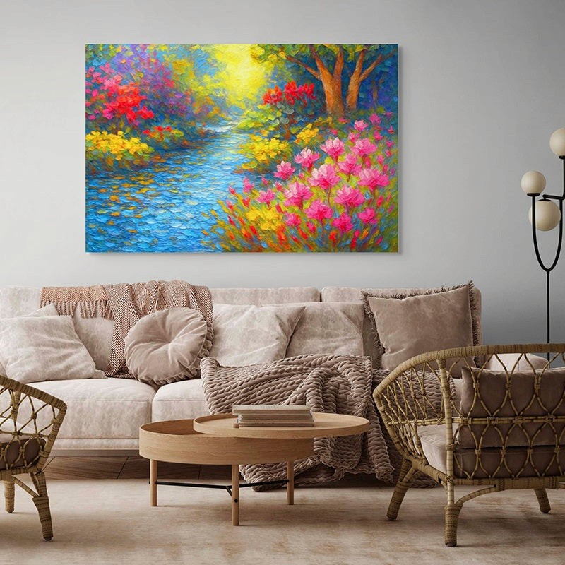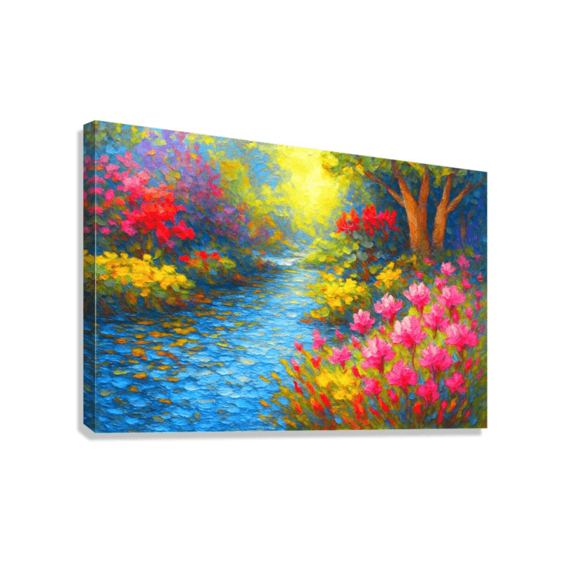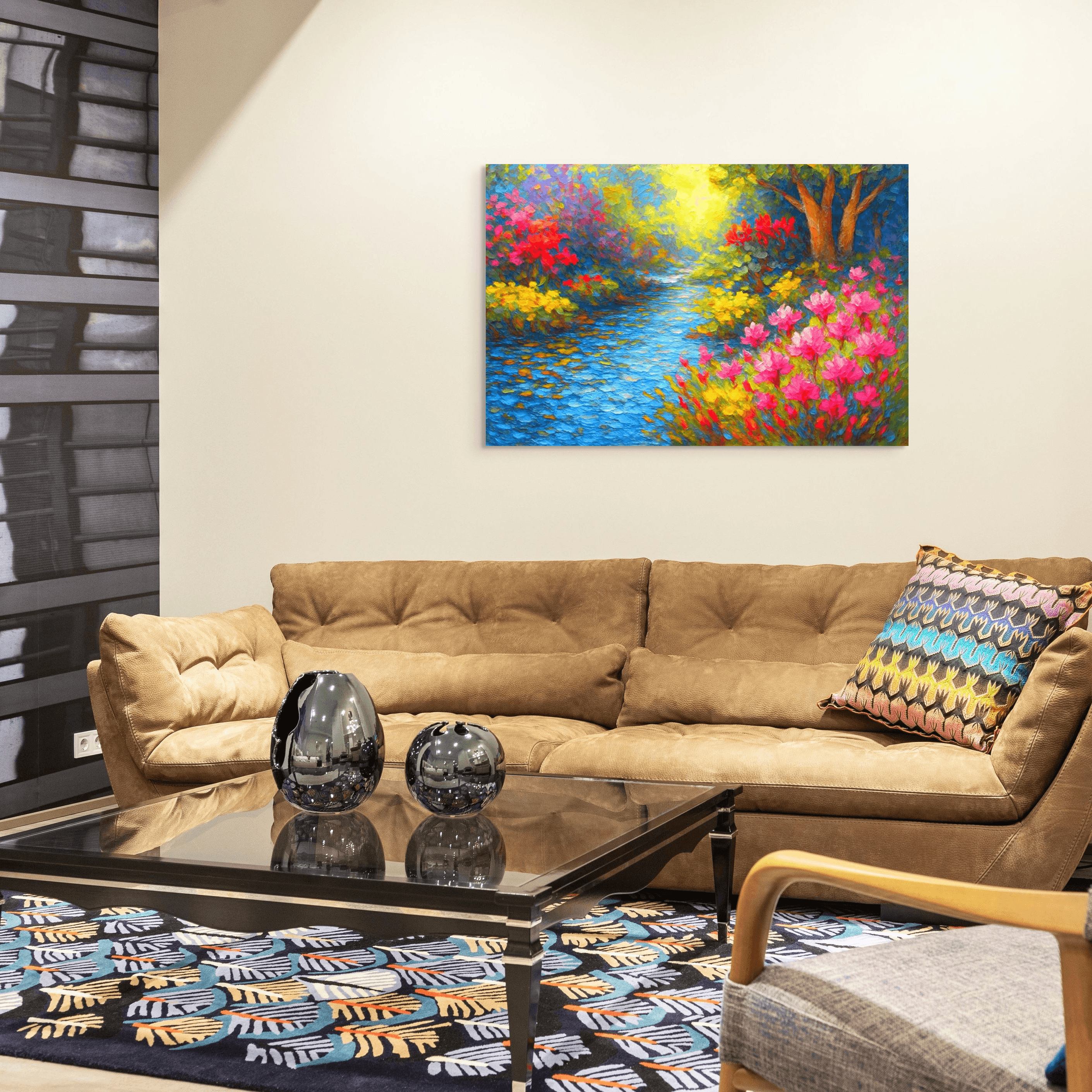 A vibrant garden landscape bursting with color and light. Bright flowers surround a peaceful blue stream, leading the eye toward a warm, glowing horizon. Filled with energy, warmth, and natural beauty, this uplifting artwork brings freshness, joy, and a cheerful atmosphere to any space.