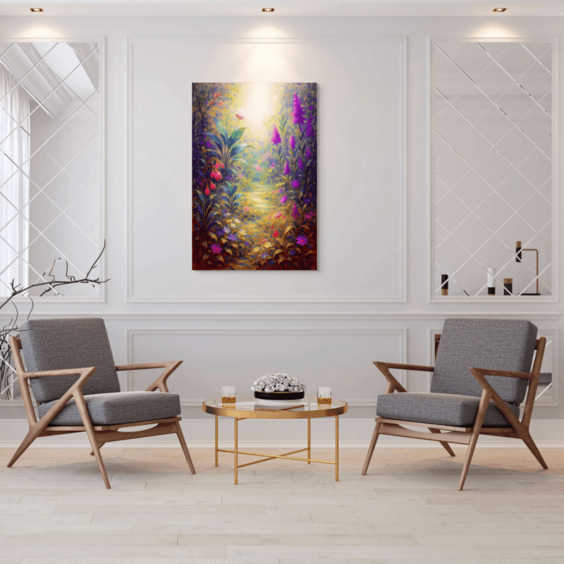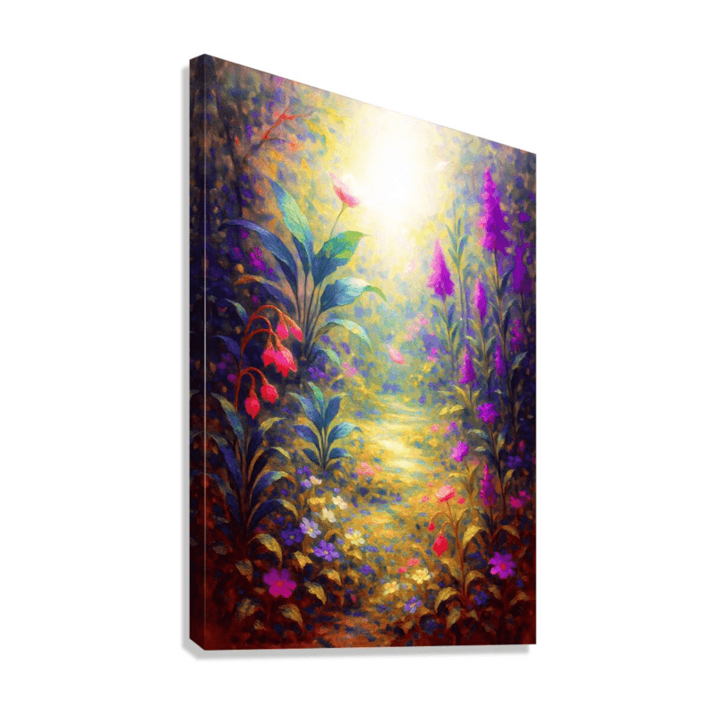 A dreamy, glowing garden path surrounded by vibrant flowers and soft light. Rich purples, pinks, and golden tones create a magical, uplifting atmosphere. A beautiful, modern artwork that brings warmth, color, and a touch of wonder to any space.