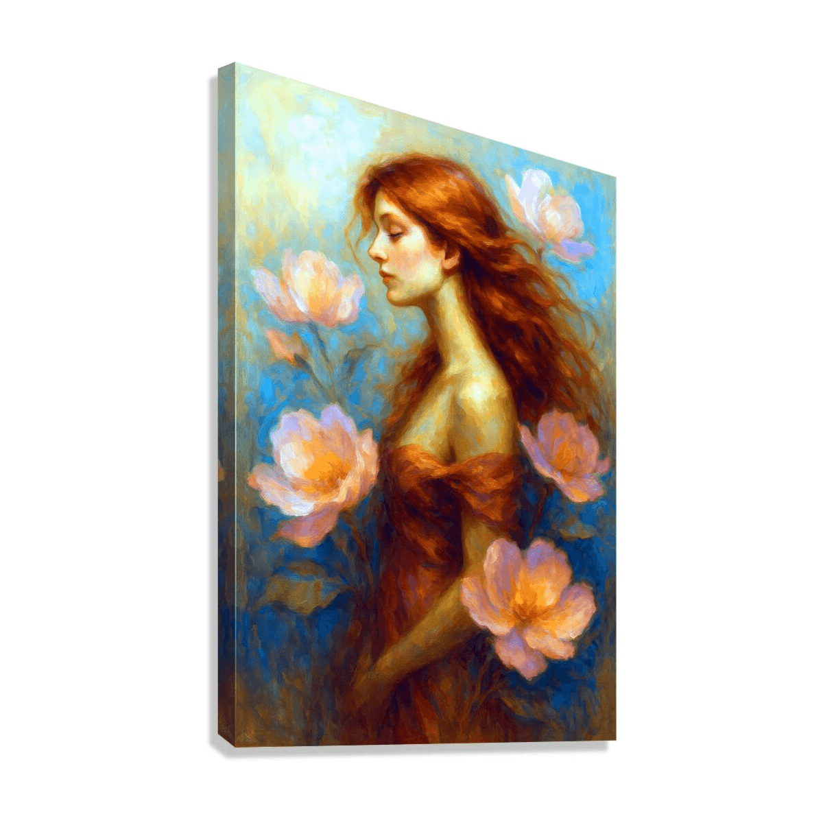 A warm, luminous painting celebrating beauty and serenity. Soft petals surround a graceful figure, blending gentle florals with glowing light and rich, flowing color. Uplifting, elegant, and modern — a radiant statement piece that brings calm, warmth, and refined charm to any space.