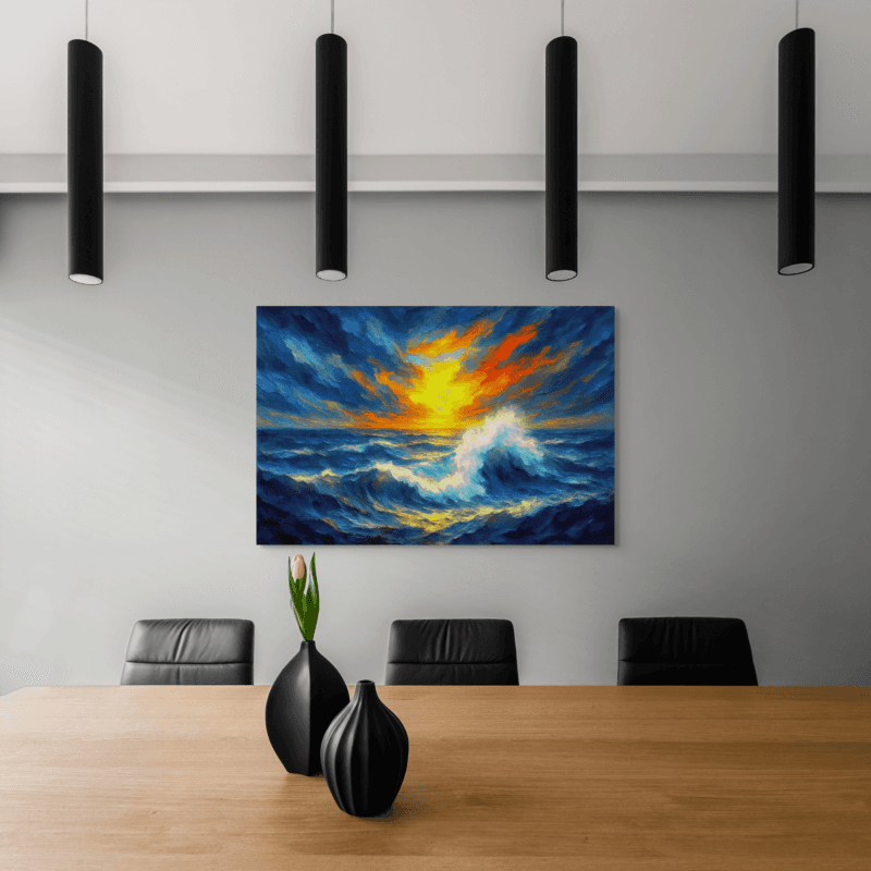 A powerful ocean sunset painted with vivid blues, warm golds, and striking waves. The glowing sky and dynamic water create a dramatic yet uplifting sense of energy and light. A bold, modern seascape that brings movement, color, and a refreshing coastal feel to any space.