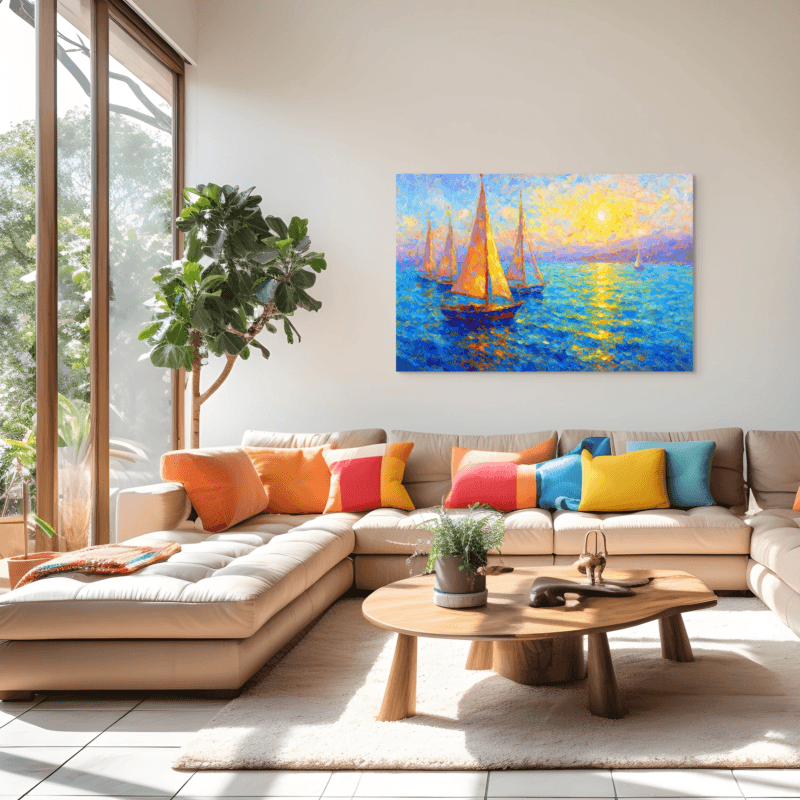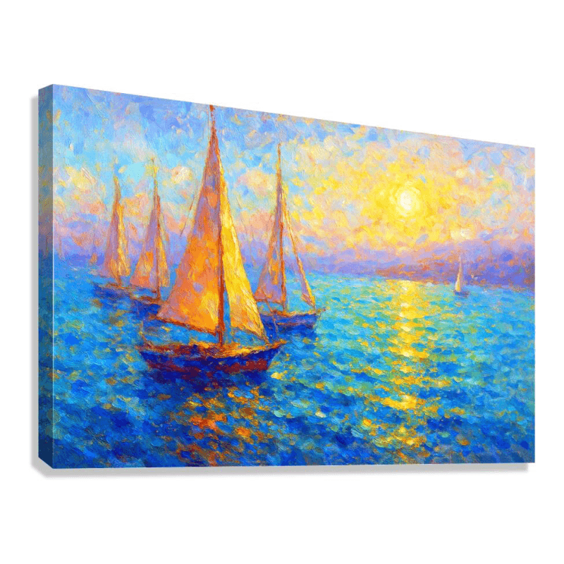 A peaceful sunrise unfolds across shimmering blue waters as elegant sailboats drift toward the horizon. Soft, radiant light and vibrant impressionist color bring a sense of calm, hope, and open-air freedom. A bright, uplifting seascape that adds modern elegance and serenity to any space.