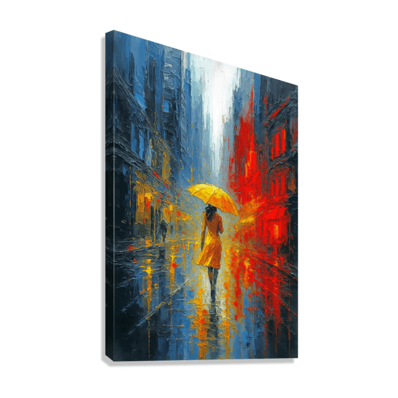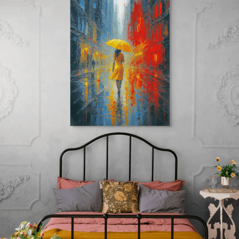 A vibrant cityscape brought to life with bold color and glowing reflections. A figure with a bright yellow umbrella walks through the rain, adding warmth and optimism to the cool urban scene. Modern, expressive, and full of energy — a striking piece that brings color, movement, and an uplifting mood to any space.