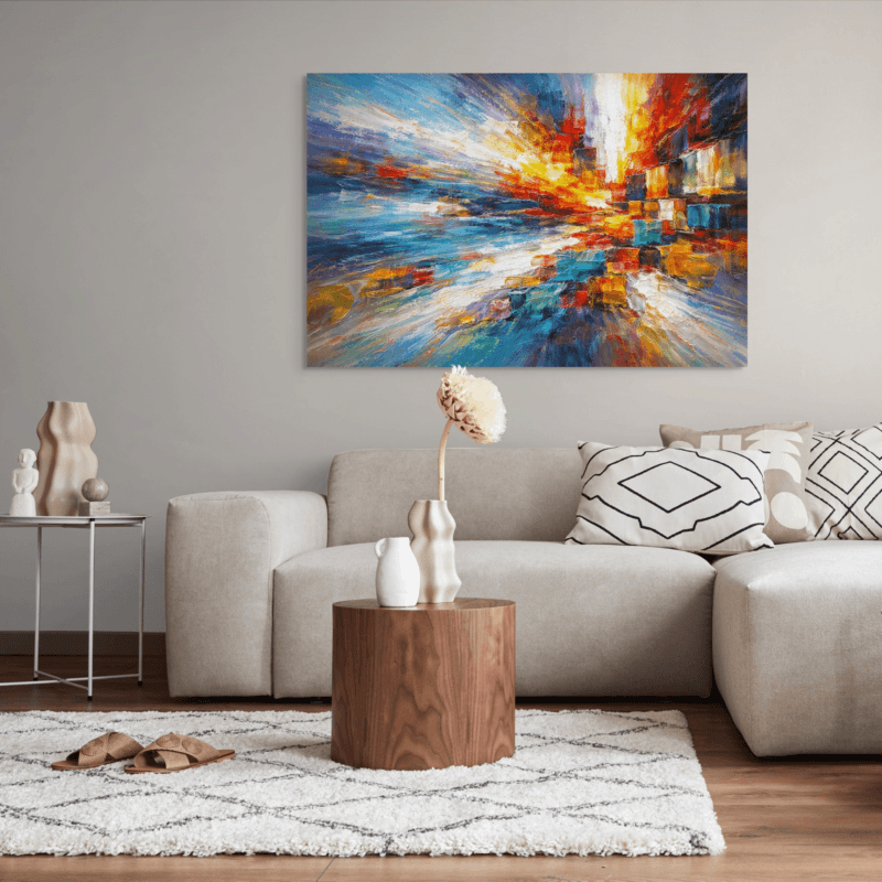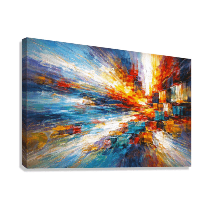 This contemporary abstract artwork captures the energy of light and color in motion, creating a joyful and expressive visual rhythm. Its rich texture and glowing tones enhance a home with modern elegance while adding warmth, balance, and a sense of positive energy.