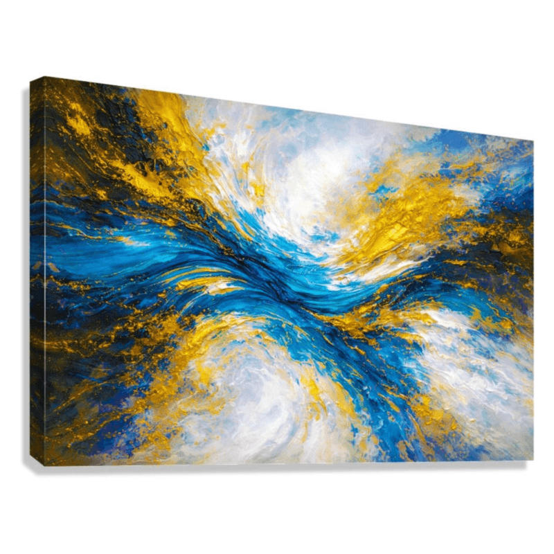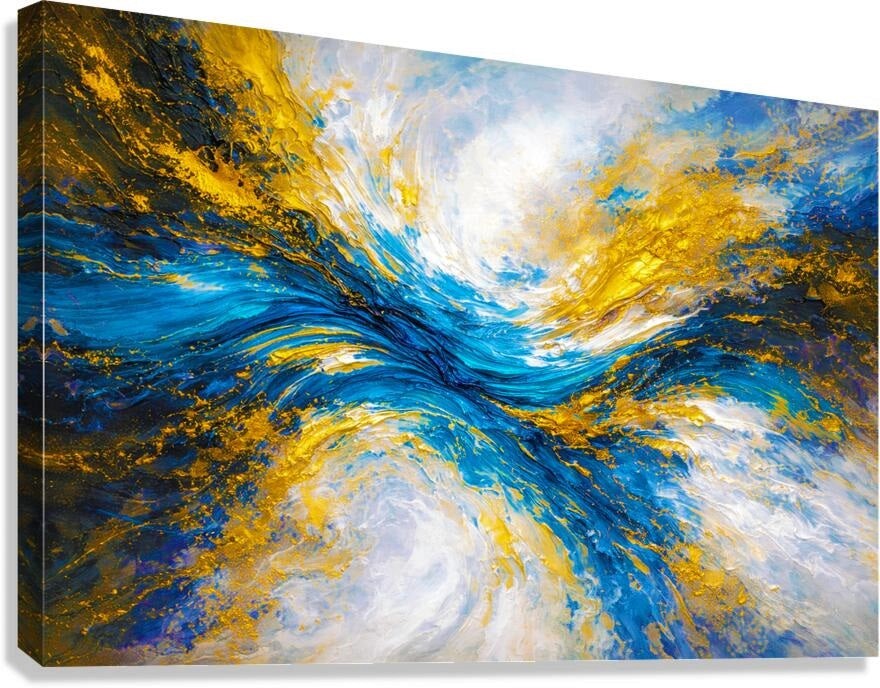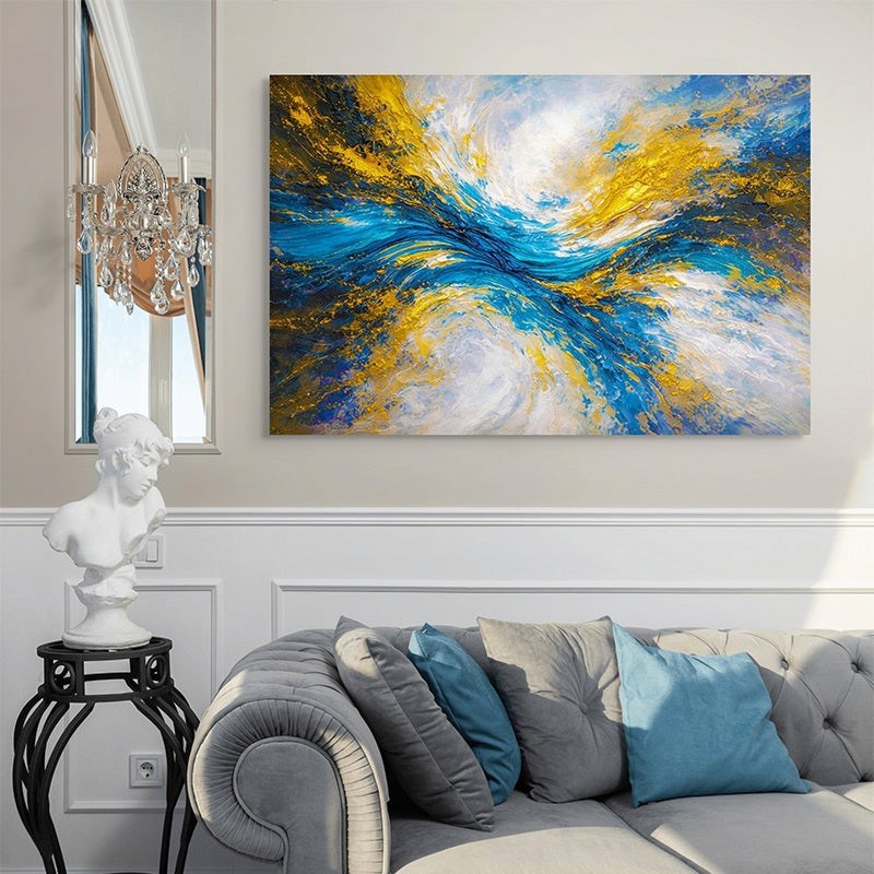 Radiant blue tones meet gold in a dynamic yet controlled exchange.