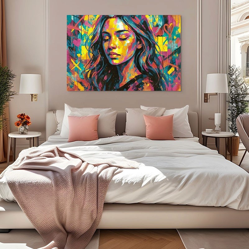 A vibrant, modern portrait painted with rich, expressive colors and soft, peaceful emotion. The closed-eye pose brings a sense of calm and inner strength, beautifully contrasted with the lively background. A striking contemporary artwork that adds warmth, energy, and uplifting color to any space.