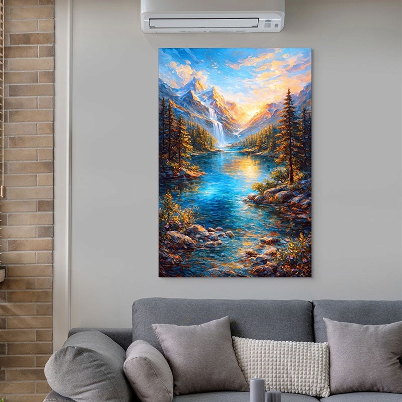 A breathtaking mountain landscape filled with glowing light, crystal-blue water, and peaceful natural beauty. This vibrant fine-art piece brings a sense of calm, wonder, and uplifting energy to any space, perfect for collectors who love serene, high-end scenery.