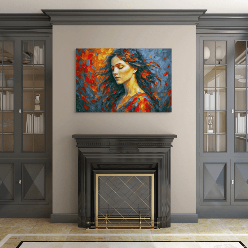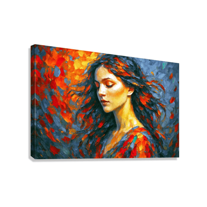 A vibrant, expressive portrait filled with glowing color and flowing movement. Warm reds and golds mix with soft blues to create a sense of energy, grace, and quiet confidence. Modern, emotional, and visually striking — a beautiful piece that brings warmth and uplifting color to any space.