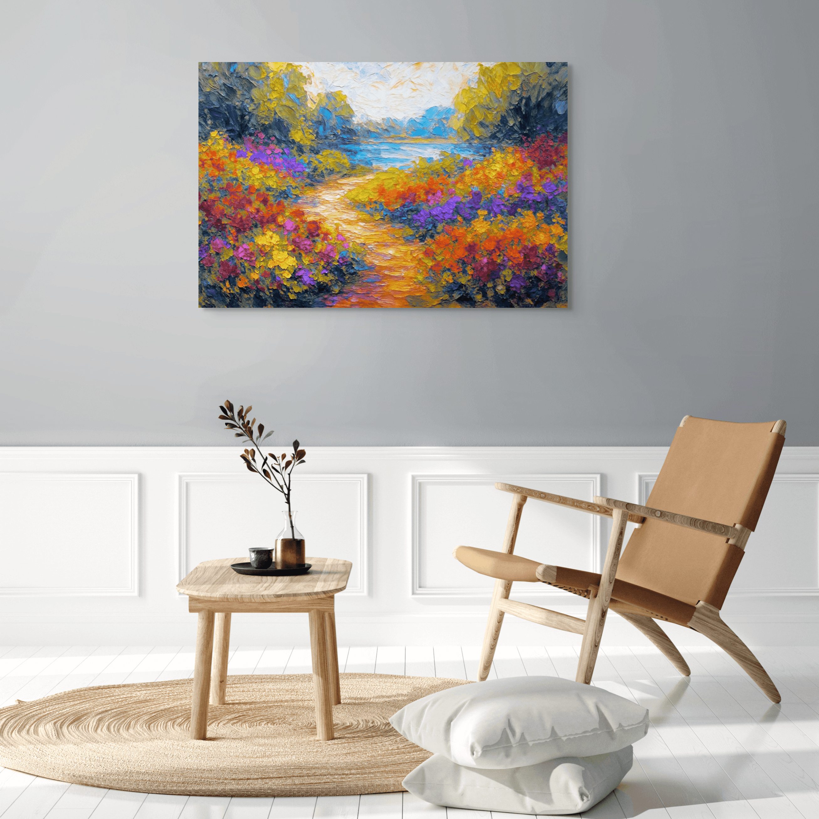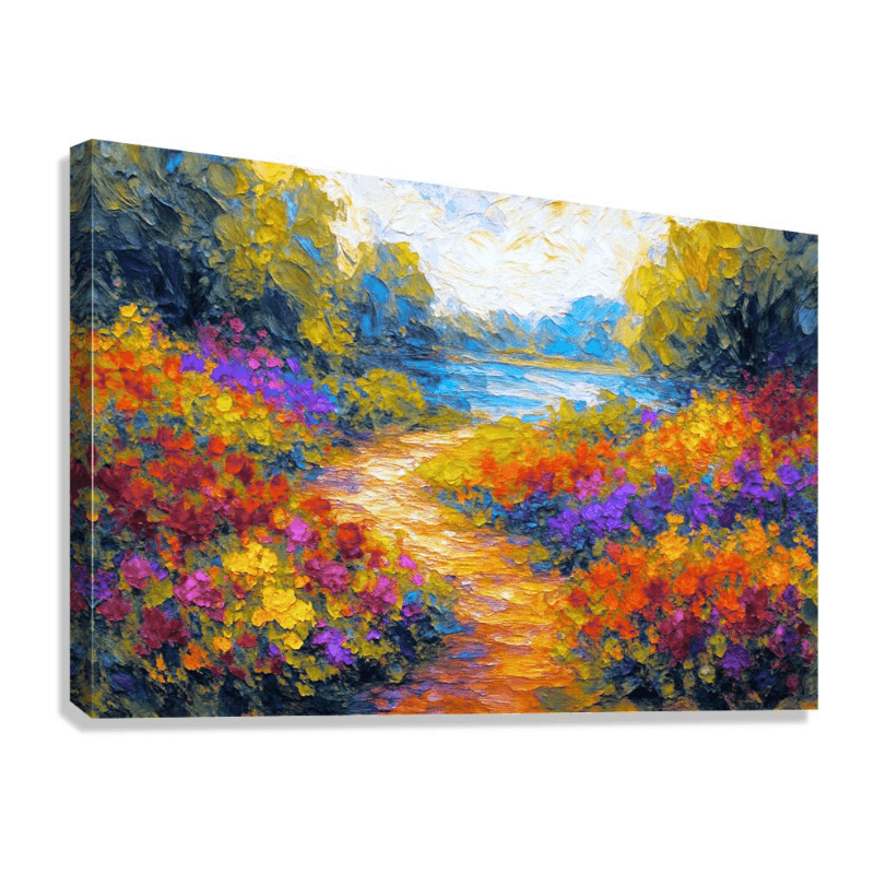 A radiant garden pathway unfolds in vibrant color and uplifting light. Rich, expressive impasto brushwork adds depth and movement, guiding the eye toward a peaceful horizon. This high-end gallery piece brings joy, warmth, and modern elegance into any space—perfect for collectors who love bright and inspiring artwork.