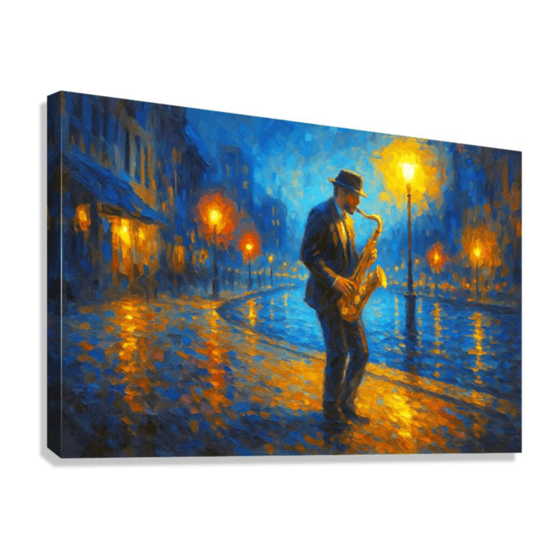 A soulful city-night scene with a saxophonist playing under glowing streetlamps. Deep blues and warm golds create a calm, atmospheric mood with soft reflections and impressionistic brushstrokes. A modern, inviting piece that adds warmth and depth to any room.