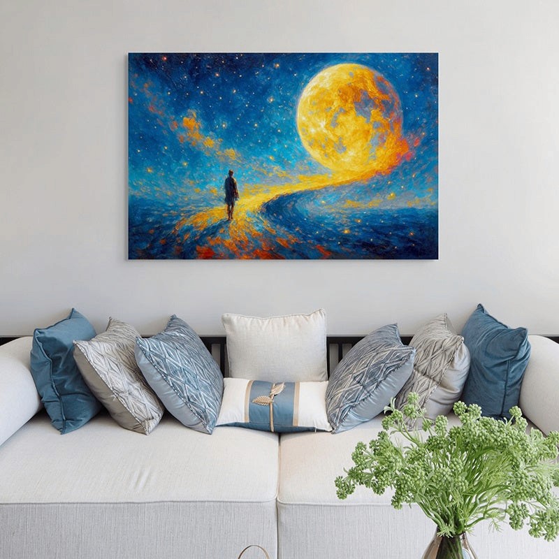 A dreamy, magical nightscape featuring a glowing golden moon and a bright path leading toward it. Deep blues and warm yellows blend into a vibrant, uplifting atmosphere filled with stars and wonder. A modern, inspiring artwork that brings imagination, light, and a sense of possibility to any space.