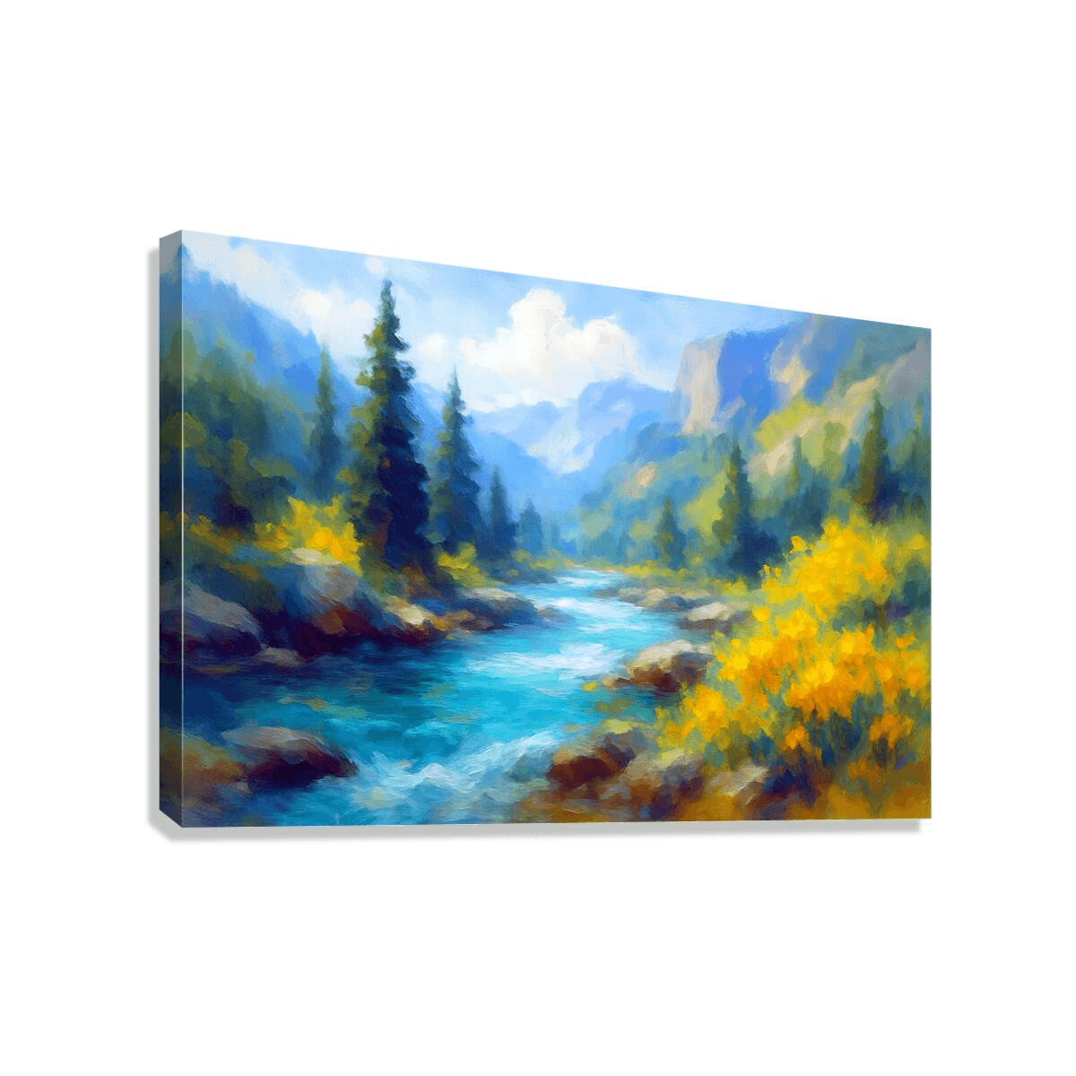 A serene mountain landscape filled with bright water, soft light, and lush color. The turquoise river winds gently through sunlit trees and distant peaks, creating a peaceful, refreshing atmosphere. A modern, uplifting artwork that brings nature’s calm, clarity, and beauty to any space.