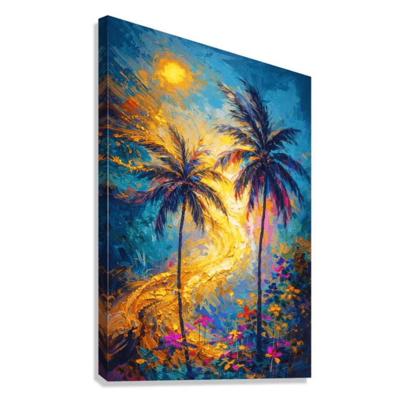 Warm light flows through vibrant palms, blending energy and calm in a luminous escape. Rich color and motion create a sense of depth and quiet optimism.