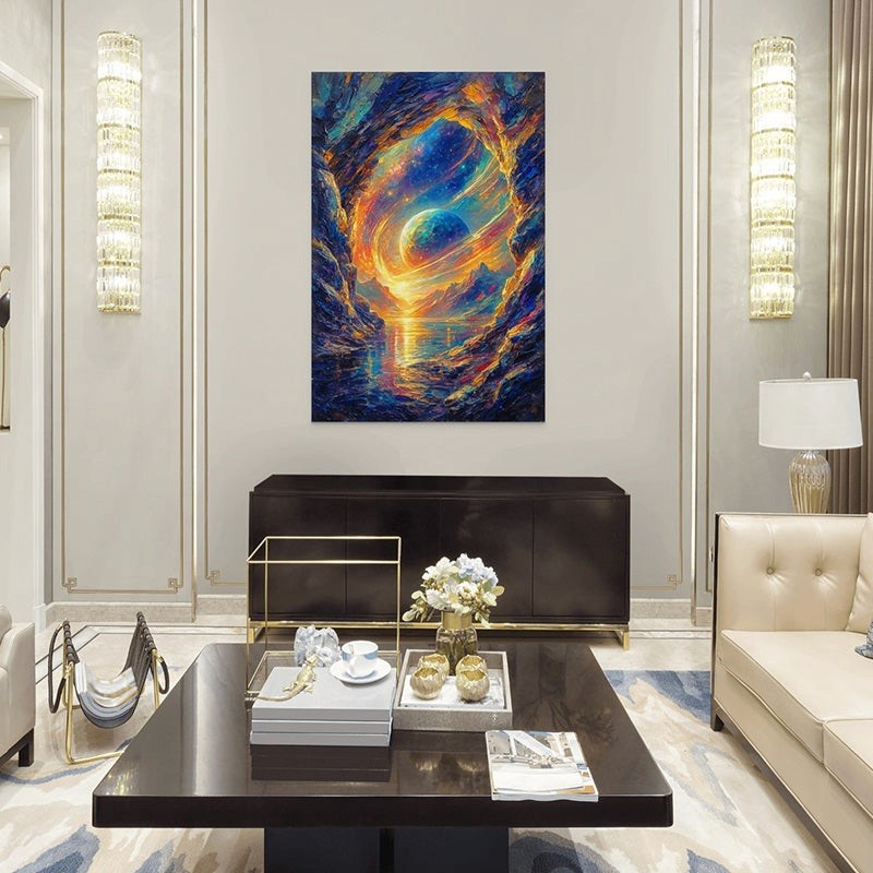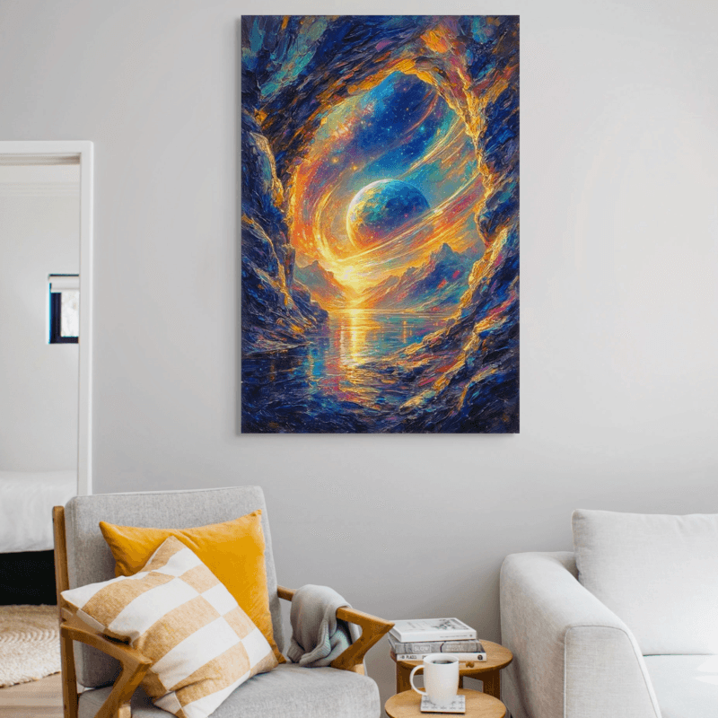 A breathtaking cosmic scene glowing with vibrant color and light. A radiant planet rises over calm waters, framed by luminous rock formations and swirling galaxies. Bold, imaginative, and inspiring — a modern artwork that brings wonder, energy, and a sense of limitless possibility to any space.