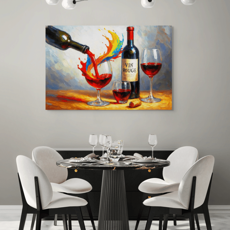 A vibrant impressionistic painting capturing the joy of shared moments—rich reds, playful movement, and the simple pleasure of wine poured in warm light. It brings an easy, upbeat energy that makes any space feel more welcoming and alive.