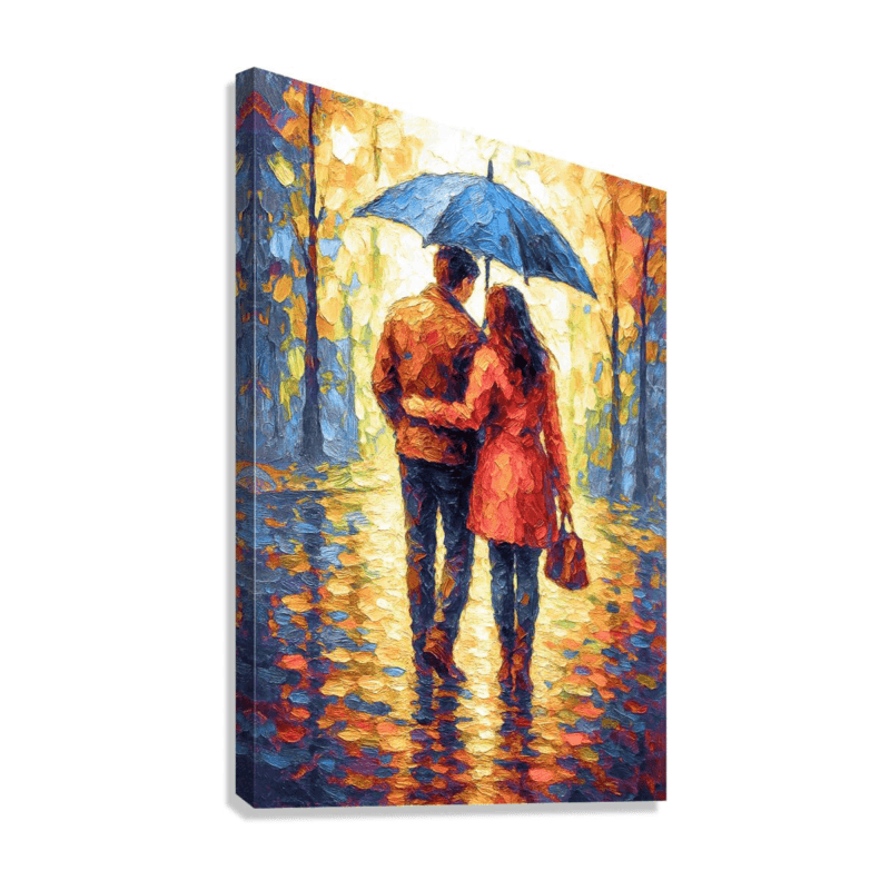 A warm and romantic painting of a couple walking arm in arm under a blue umbrella. Soft golden light reflects across the rain-kissed path, creating a cozy, uplifting atmosphere. A modern, heartfelt artwork that brings warmth, color, and a touch of love to any space.