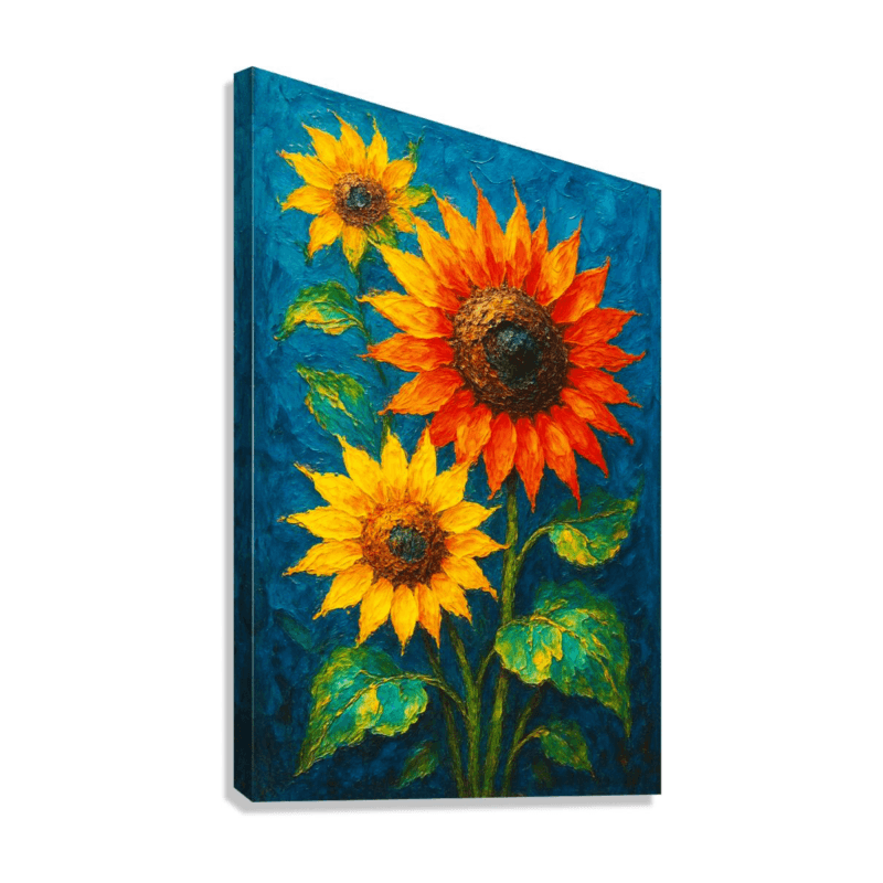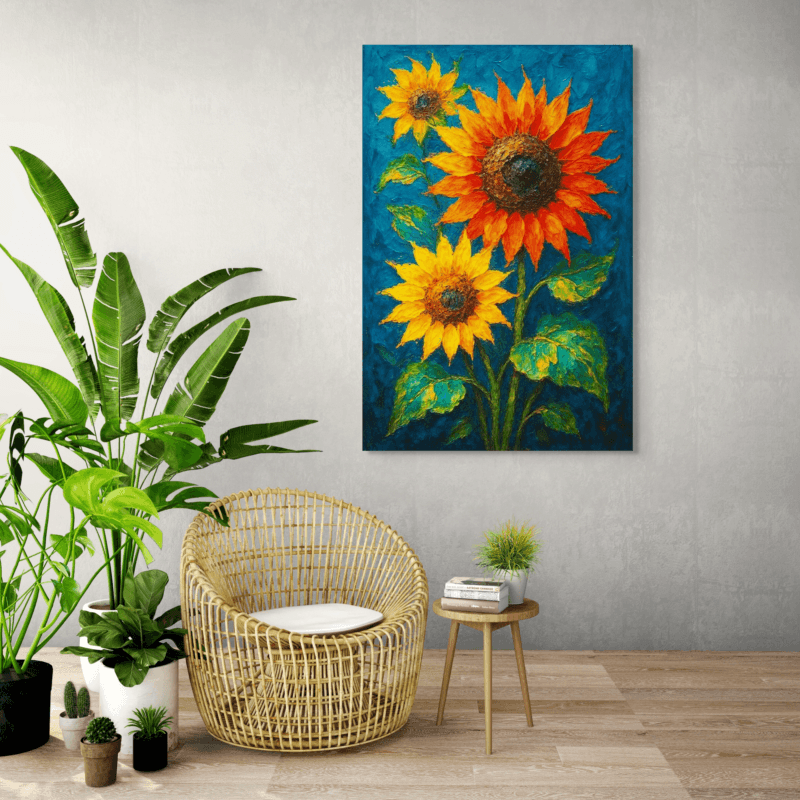 A bright and cheerful sunflower painting bursting with warm yellows, bold oranges, and rich texture. The vibrant petals and deep blue background create a lively, uplifting mood. A modern, joyful artwork that brings sunshine, color, and positive energy to any space.