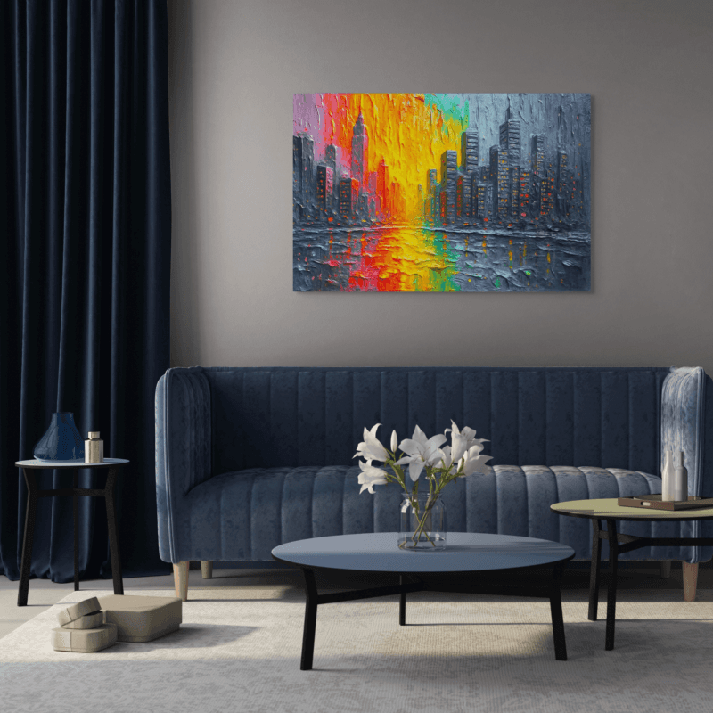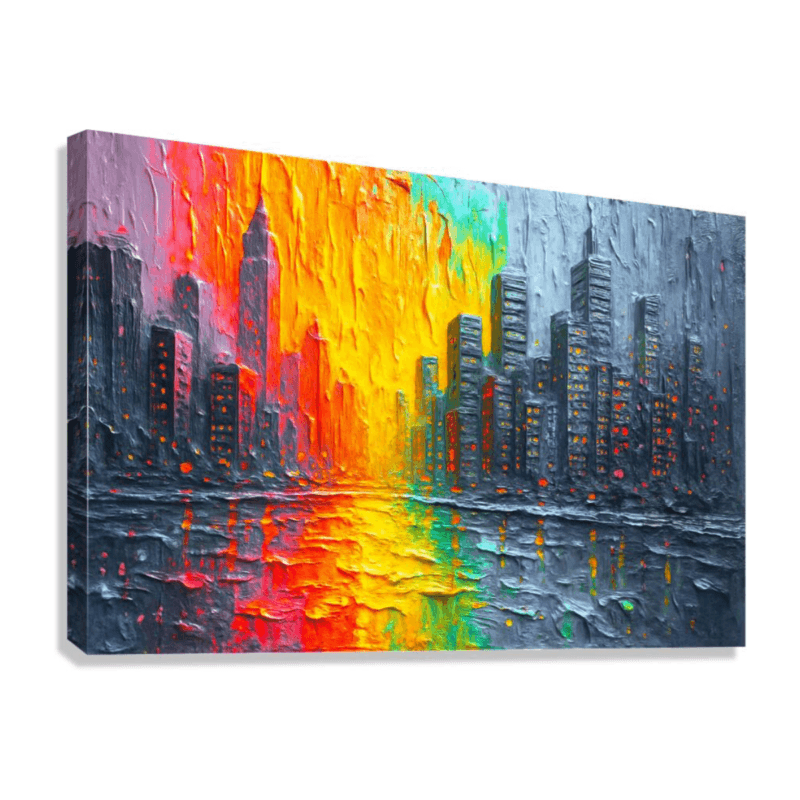 A vibrant abstract cityscape where glowing color meets textured skyline—energetic, modern, and full of movement. Warm light and cool tones balance excitement with calm, creating a sense of optimism and possibility. This piece brings energy, depth, and a contemporary edge to a space, making any room feel more alive and visually engaging.