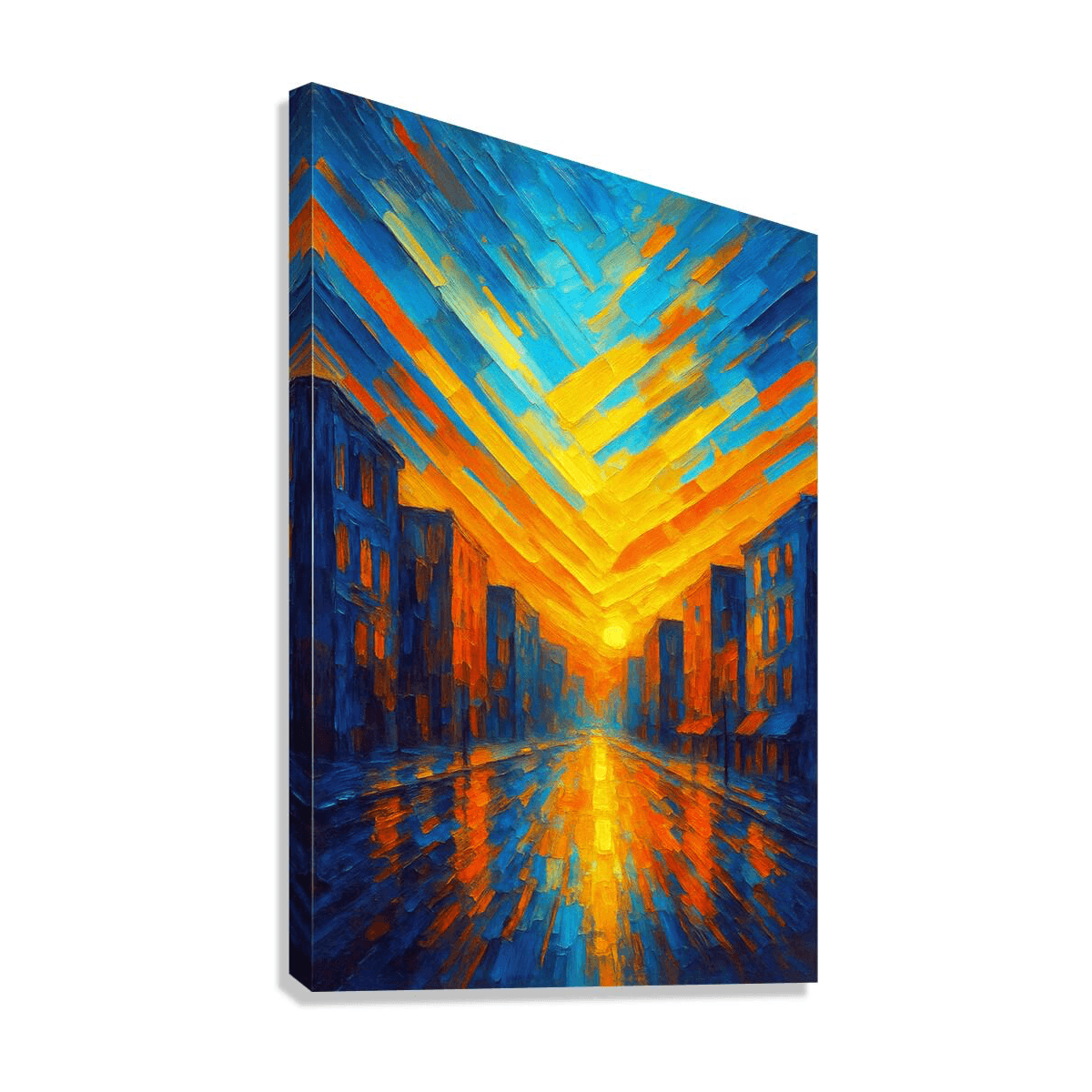 A bright, energetic cityscape glowing with warm sunrise colors and bold brushstrokes. Golden light reflects across the street, blending beautifully with cool blues to create a vibrant, uplifting mood. A modern, striking piece that brings warmth, color, and positive energy to any space.