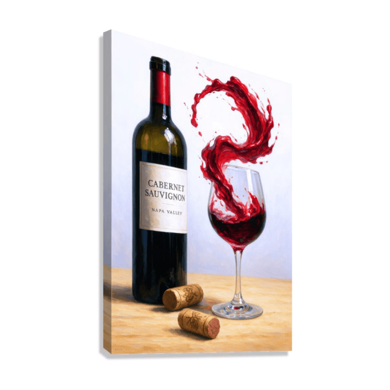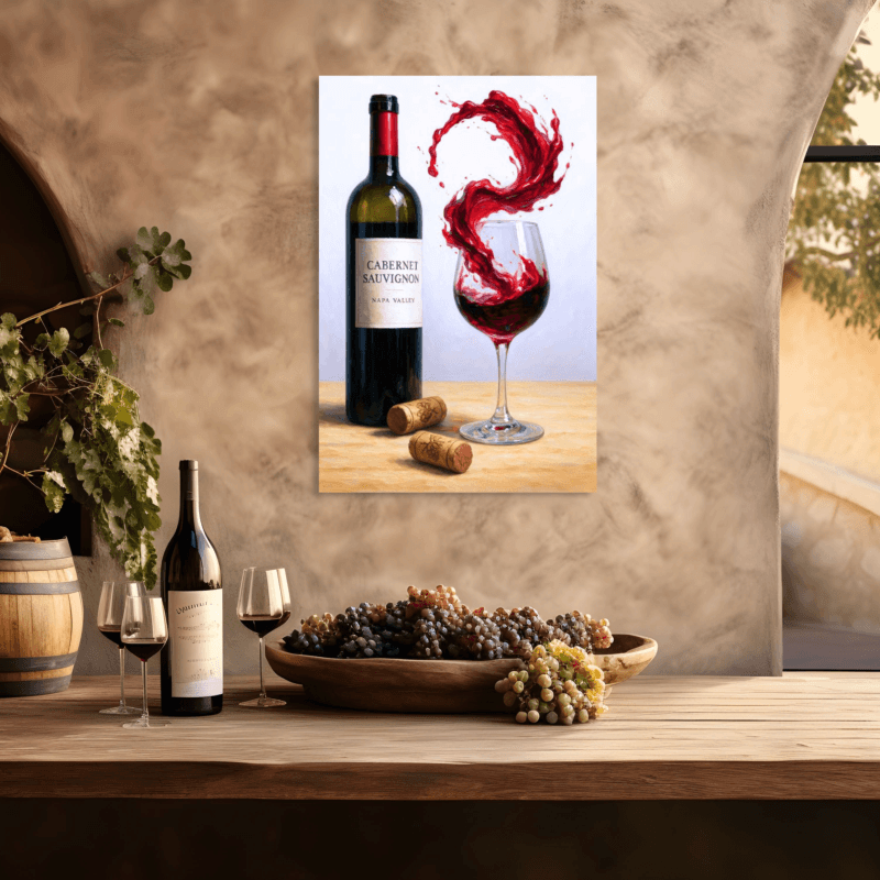 A lively swirl of deep red wine captures a moment of motion, celebration, and quiet joy. The rich tones and fluid energy bring warmth and personality to a space, making it a perfect accent for dining areas, kitchens, or places meant for gathering.