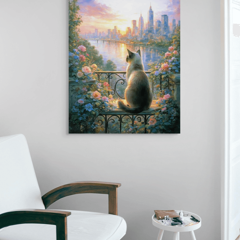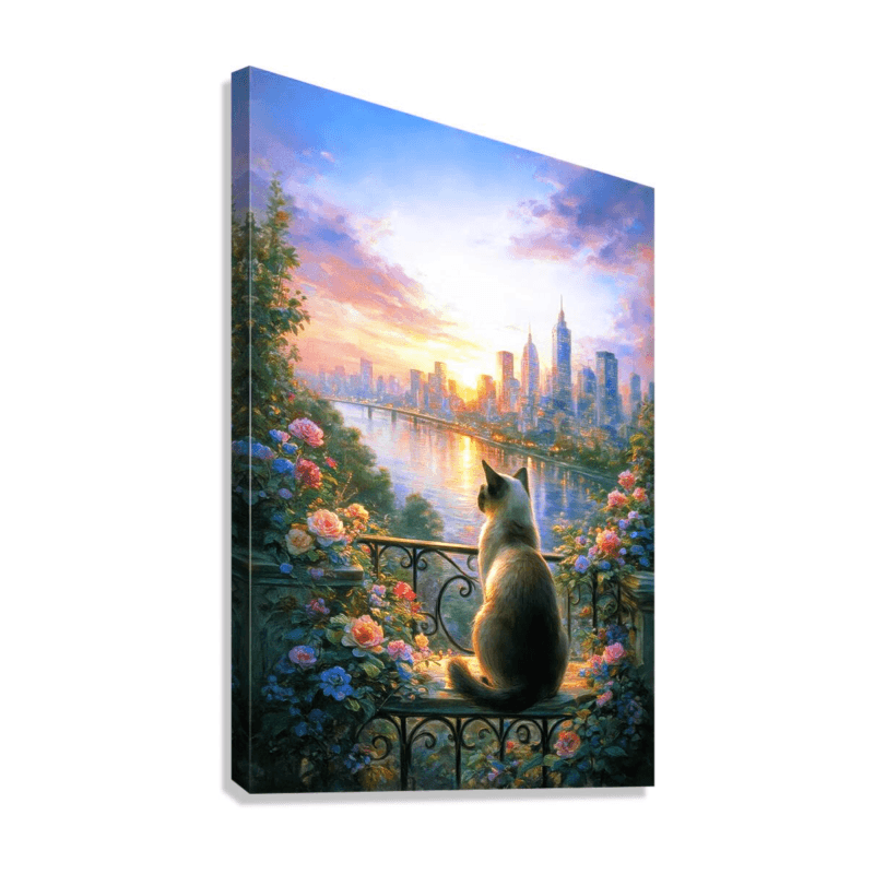 A charming and dreamy scene of a cat peacefully watching the sunset over a glowing city skyline. Soft light, colorful flowers, and warm reflections create a gentle, uplifting atmosphere. A modern, heart-warming artwork that brings serenity, beauty, and a touch of wonder to any space.